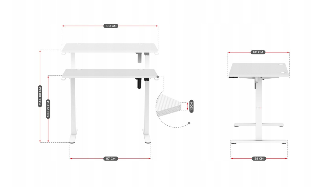 Biurko z regulowaną wysokością blatu to doskonały towarzysz wielogodzinnych sesji gamingowych, maratonów nauki i intensywnej pracy. Dzięki możliwości obniżania i podnoszenia blatu możesz w każdej chwili przyjąć wygodną pozycję. Regulacja wysokości biurka w zakresie od 72 do 118 cm pozwala na pracę na stojąco i siedząco.