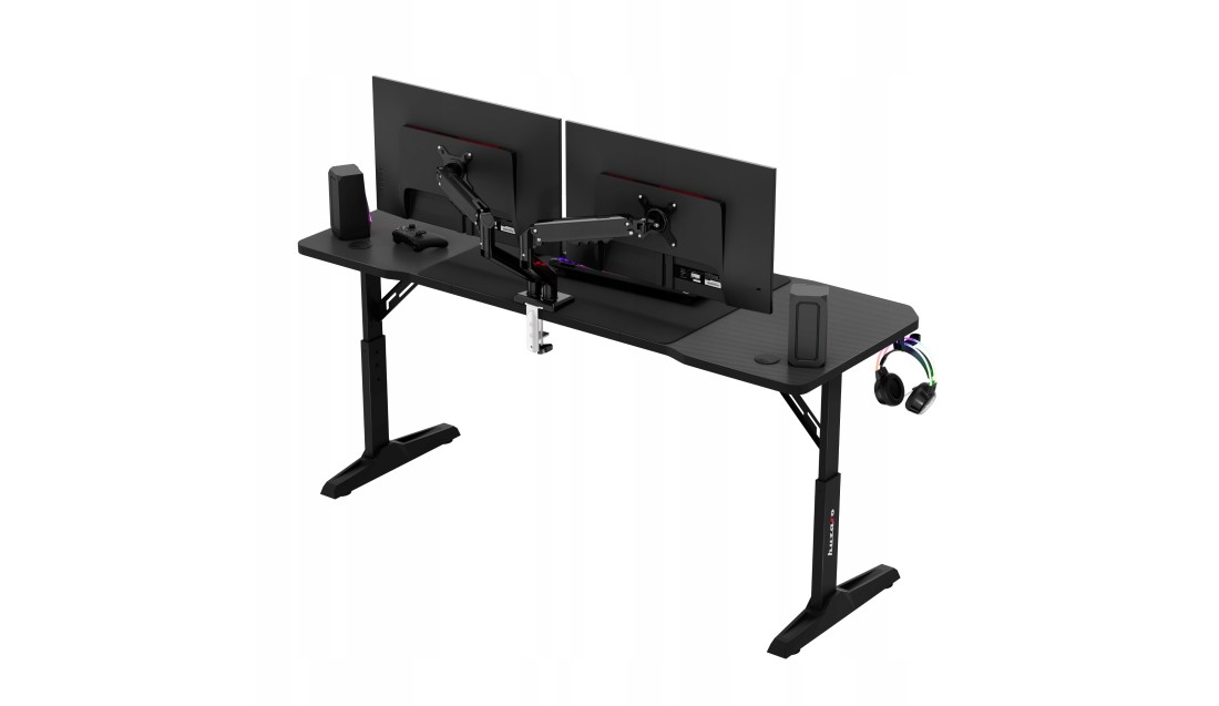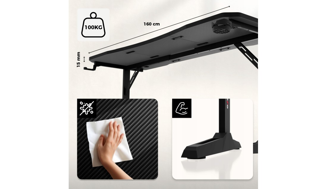 - Blat 160 × 60 cm – ogromna przestrzeń na kilka monitorów, pełny setup i akcesoria