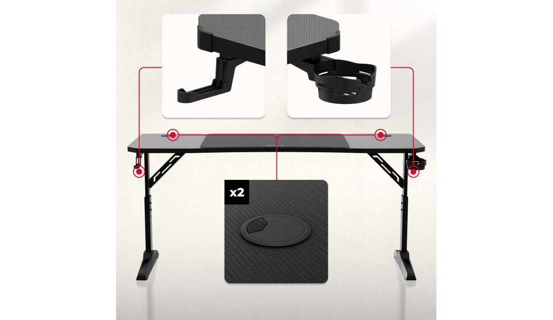 - Wyposażenie: uchwyt na słuchawki, haczyk na plecak/torbę, uchwyt na napój, podkładka XXL