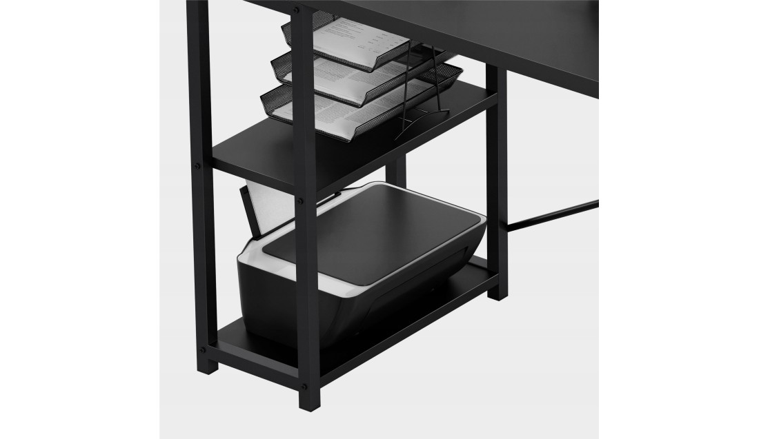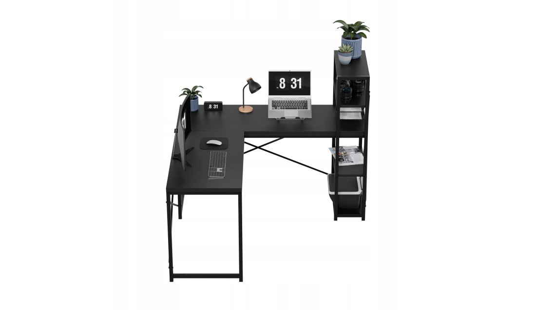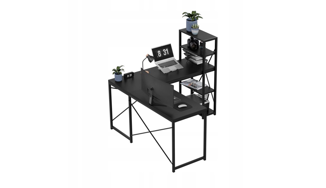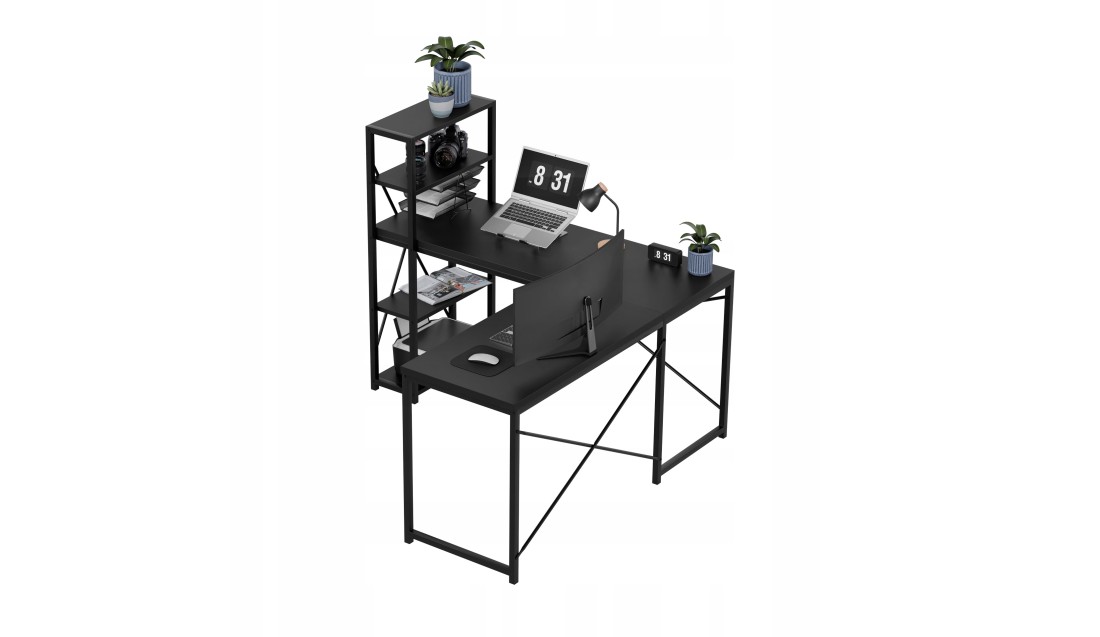 Duża przestrzeń robocza o wymiarach 145 cm x 145 cm daje swobodę działania, niezależnie od tego, czy pracujesz z laptopem, dokumentami, czy potrzebujesz miejsca na dodatkowy monitor. Liczne półki to praktyczne rozwiązanie, które ułatwia organizację – zawsze znajdziesz miejsce na książki, akcesoria czy dekoracje, które stworzą przyjemną atmosferę.