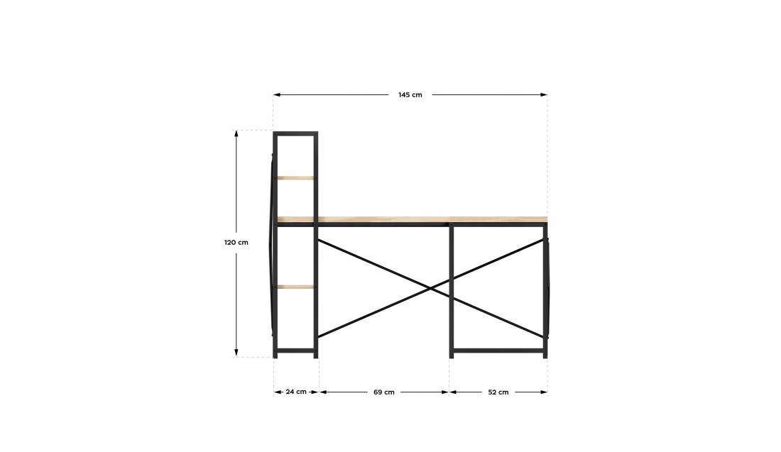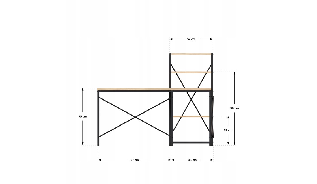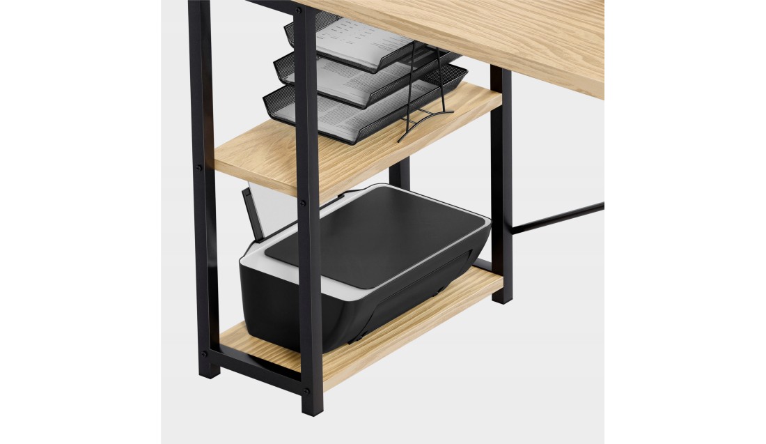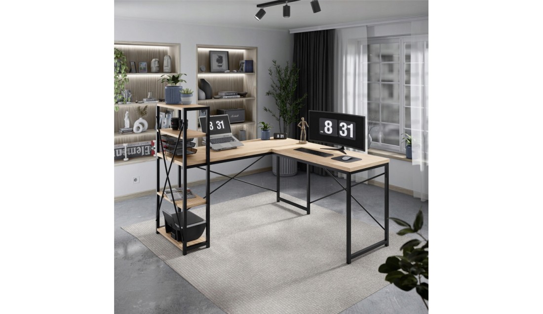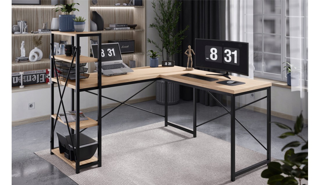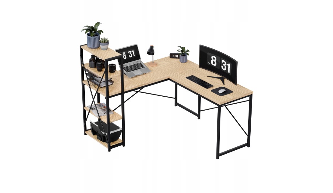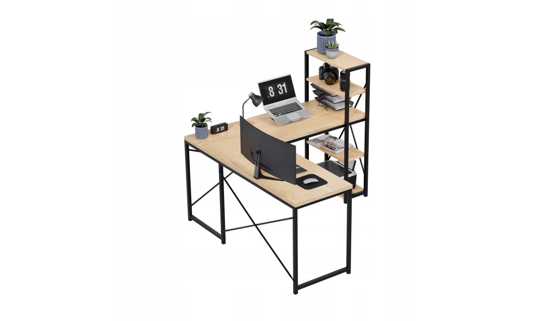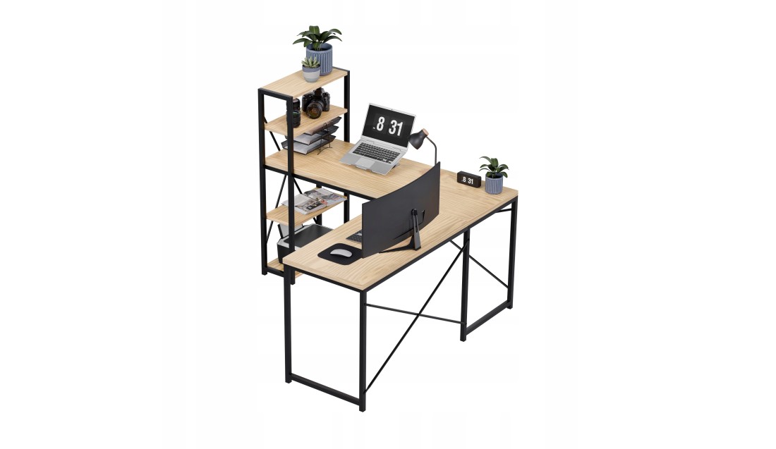 Duża przestrzeń robocza o wymiarach 145 cm x 145 cm daje swobodę działania, niezależnie od tego, czy pracujesz z laptopem, dokumentami, czy potrzebujesz miejsca na dodatkowy monitor. Liczne półki to praktyczne rozwiązanie, które ułatwia organizację – zawsze znajdziesz miejsce na książki, akcesoria czy dekoracje, które stworzą przyjemną atmosferę.