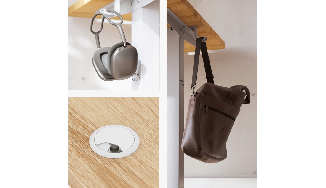 • Wieszaki na torbę lub plecak – wygodne przechowywanie, oszczędność miejsca pod biurkiem.