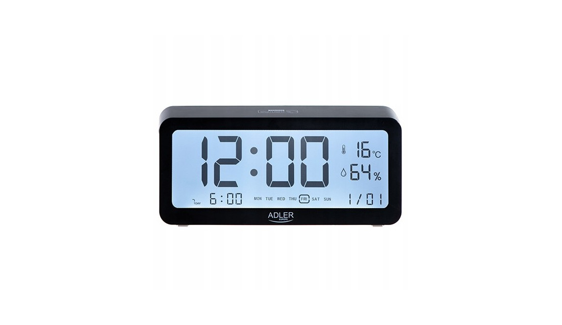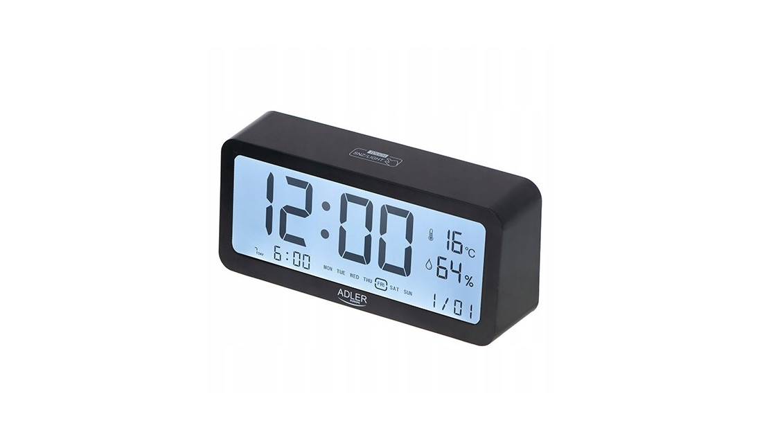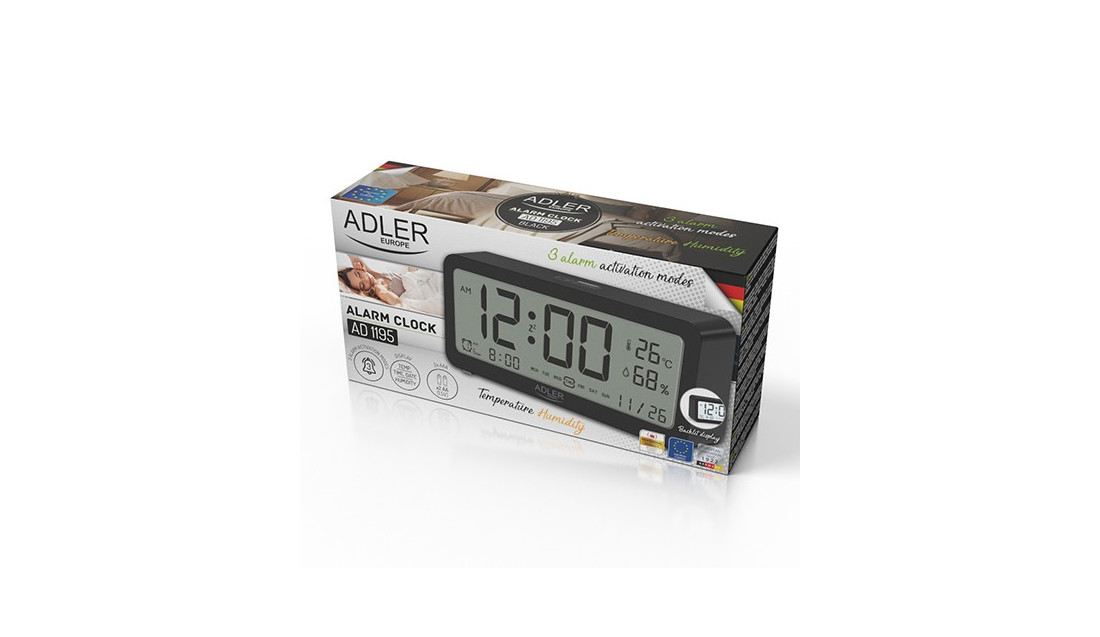Budzik AD 1195 to urządzenie o wielu przydatnych funkcjach, które możesz wybrać w zależności od swoich potrzeb. Przede wszystkim posiada 3 oddzielne ustawienia godzin alarmów i wyświetla: czas, datę, temperaturę, wilgotność. Dużą zaletą jest czytelny podświetlany wyświetlacz, z którego łatwo odczytasz godzinę i temperaturę. Budzik zasilany jest 2 bateriami AA. Wyświetla: czas, datę, temperaturę, wilgotność.