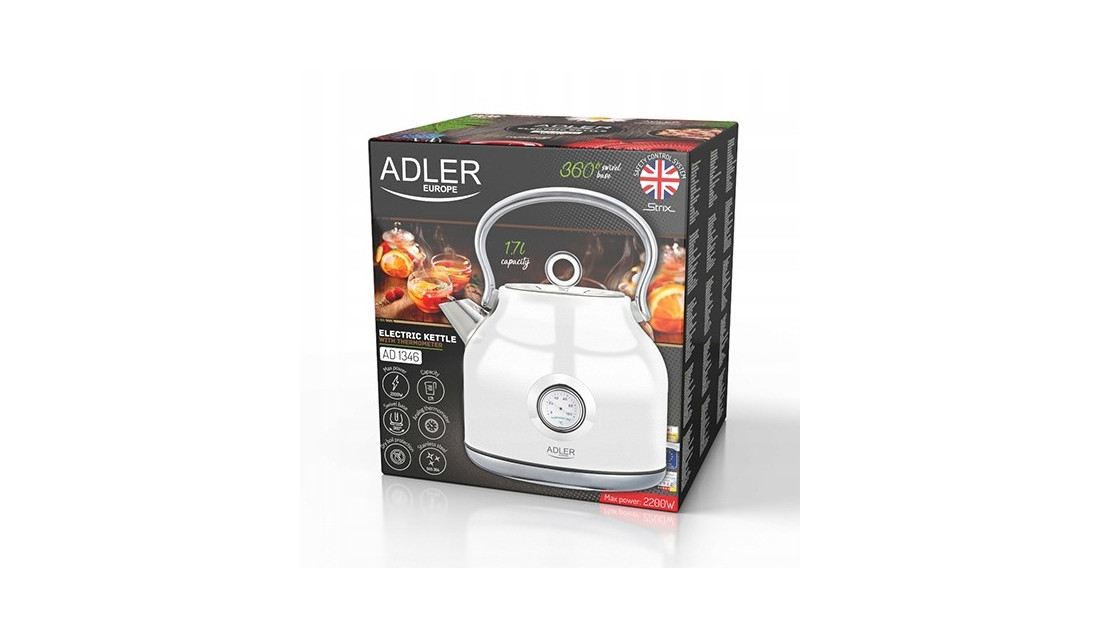 Klasyczny, 1,7-litrowy czajnik elektryczny z termometrem systemem kontroli bezpieczeństwa STRIX, przydatny w każdej kuchni. Jego bezpieczeństwo zapewnia blokada uniemożliwiająca włączenie pustego czajnika oraz automatyczne wyłączenie po zagotowaniu wody. Funkcjonalność zwiększa stabilna podstawa i czytelny wskaźnik poziomu wody. Dysponuje mocą maksymalną 2200W i wykonany jest ze stali szlachetnej, co czyni go mistrzowskim rozwiązaniem, jeśli chodzi o szybkie gotowanie wody. Analogowy wskaźnik temperatury wody i smukły kształt to cechy, dzięki którym uzupełnisz wystrój pomieszczenia urządzonego w każdym stylu.