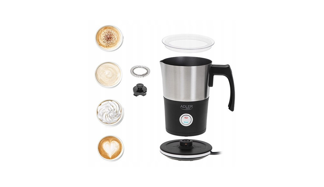 Spieniacz do mleka ADLER AD 4497 to urządzenie, dzięki któremu samodzielnie przygotujemy kawę z pianką niczym z najlepszej kawiarni. Największą zaletą proponowanego przez nas spieniacz do mleka jest to, że można go używać zarówno z zimnym, jak i z ciepłym mlekiem. Jeśli lubisz naprawdę gorącą kawę, ucieszy Cię fakt, że urządzenie samo podgrzewa mleko i jednocześnie spienia napój, dzięki czemu powstaje kremowa pianka. Urządzenie jest wyposażone w dwufunkcyjne mieszadło magnetyczne. Gdy zdejmiesz sprężynkę możesz przygotować do 300 ml gorącego mleka lub z założoną sprężynką do 120 ml pianki mlecznej.