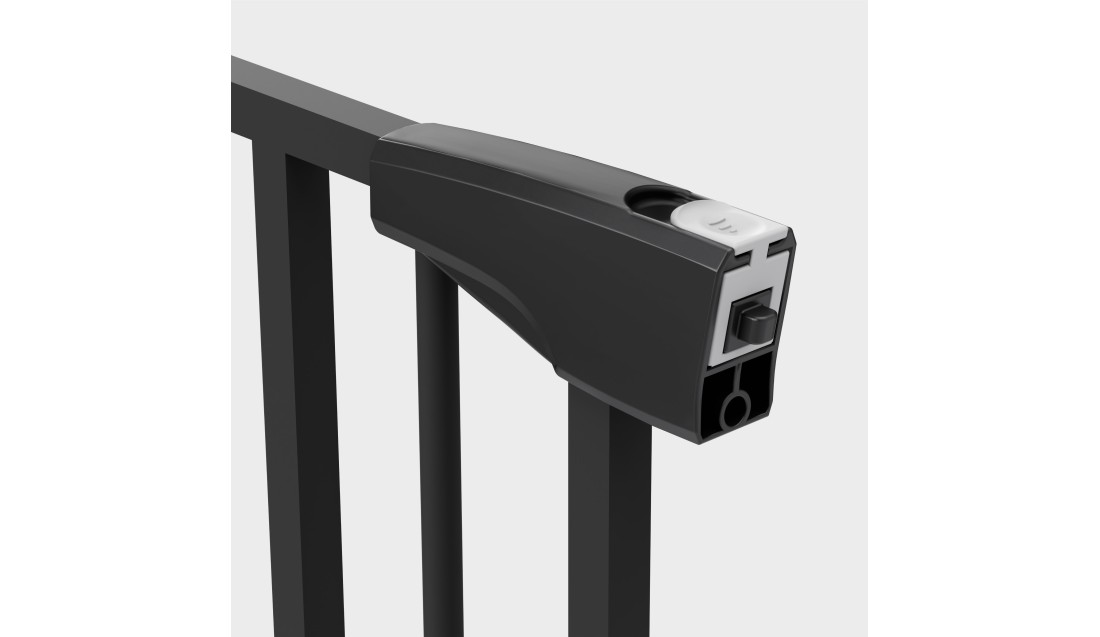 - Bramka Guardian posiada zabezpieczenie przeciwko otwieraniu jej przez dzieci w postaci przycisku w górnej części zamka. Po otwarciu barierki system zamknie ją automatycznie na wypadek, gdyby przechodząca osoba zapomniała zrobić to samodzielnie.