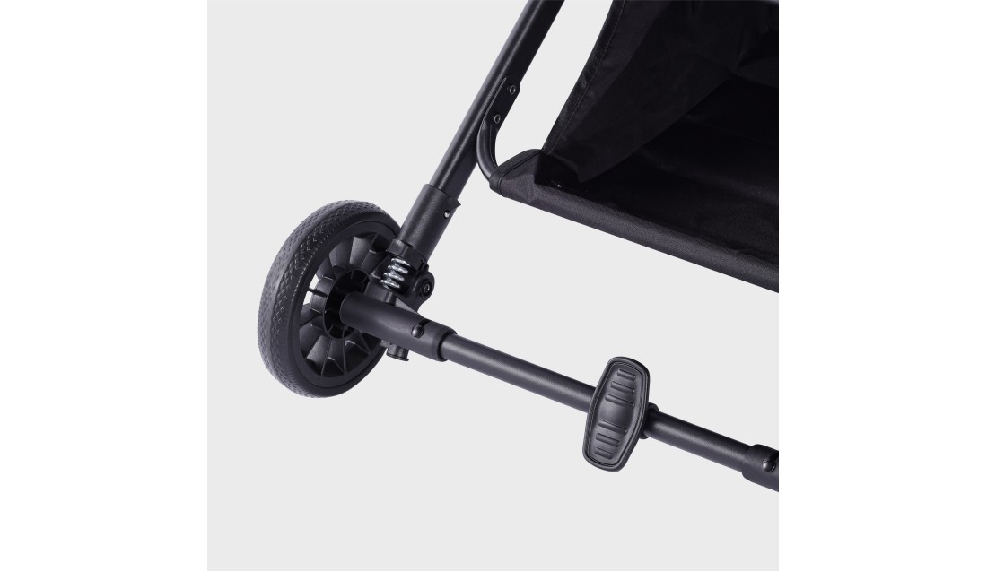 Niezawodne nieprzebijalne koła z pianki amortyzują wstrząsy, zapewniając płynną jazdę. Przednie koła (5,5”) obracają się o 360° z możliwością blokady do jazdy prosto, a tylne (6,5”) gwarantują stabilność na różnych nawierzchniach . Wózek posiada wygodny hamulec nożny, który umożliwia szybkie i bezpieczne zatrzymanie.