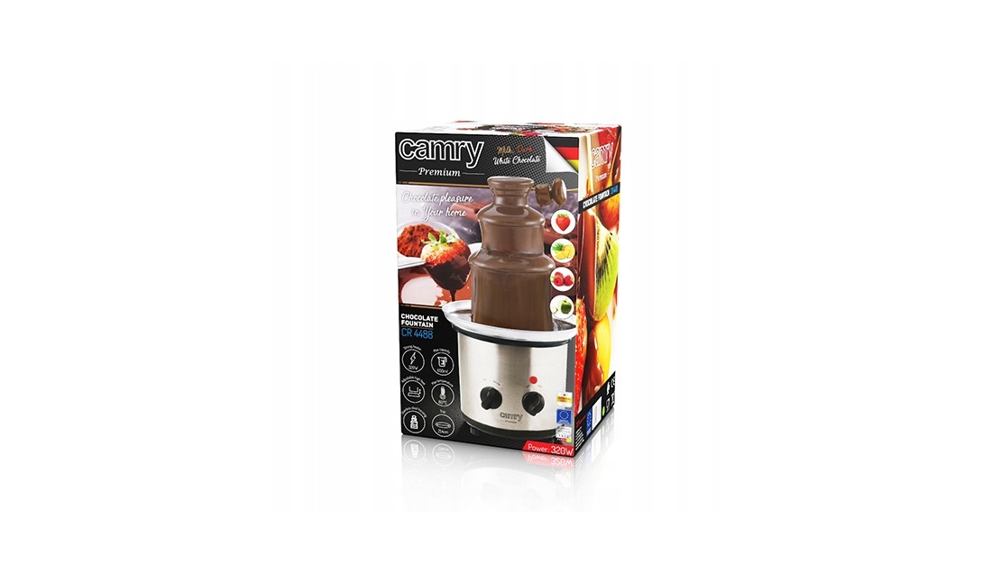 Fontanna do czekolady CR4488 uatrakcyjni każde przyjęcie. Popularna forma zabawy jedzeniem na przyjęciach weselnych i urodzinowych. Czysta przyjemność przygotowania deseru własnoręcznie. Możesz zanurzyć w czekoladzie ulubione owoce np. truskawki, winogrona, kawałki jabłek & brzoskwiń. Również urządzenie idealnie sprawdzi się do dekorowania deserów polewą czekoladową, możesz także umoczyć w płynnej czekoladzie rożki do lodów, waflowe pucharki, herbatniki, własne wypieki lub cukierki piankowe. Twoja fantazja może nie mieć granic. Fontanna do czekolady CR4488 wyposażona jest w dwa pokrętła uruchamiające obroty ślimaka i funkcję podgrzewania. Pojemna taca o średnicy 21,4cm pomieści 650ml płynnej czekolady. Mocna grzałka 320W i odporny na wysokie temperatury świderek oraz wieża fontanny i taca wykonane ze stali nierdzewnej dlatego zapewnią długie użytkowanie.