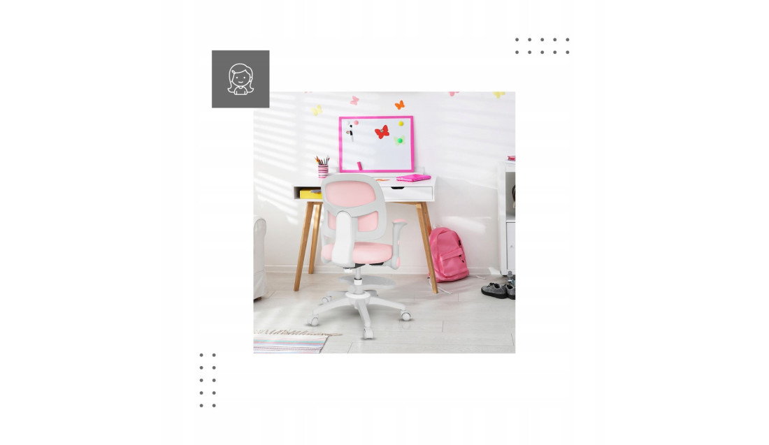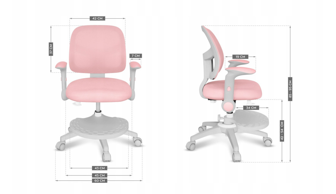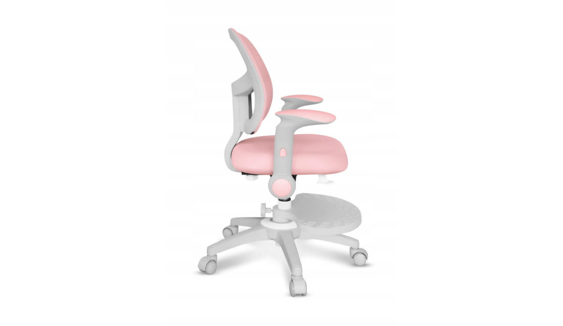 - Design fotela jest dostosowany do potrzeb rosnącego dziecka. Dzięki regulacji wysokości krzesła, podłokietników i podnóżka, krzesło obrotowe różowe dopasować można do różnego wzrostu.