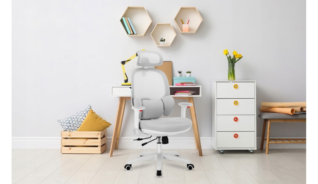Ergonomiczny zagłówek 2D można dowolnie regulować w pionie i poziomie, aby zapewnić dziecku optymalne podparcie szyi i głowy. To szczególnie ważne podczas czytania, nauki czy korzystania z komputera, ponieważ zmniejsza napięcie karku i zapobiega bólom szyi.