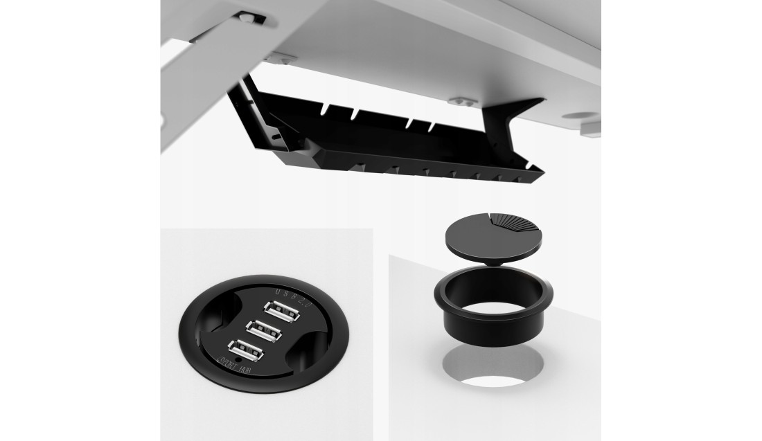 System organizacji kabli - praktyczny otwór i specjalny półka pod blatem na kable.