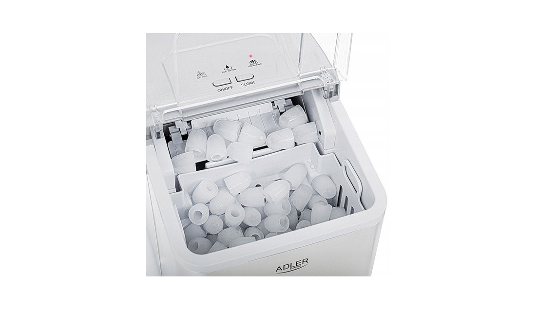 - Wskaźnik zapełnienia pojemnika na lód - urządzenie posiada zbiornik zbierający przygotowany lód o pojemności 0,6 kg - gdy ten zbiornik jest pełny, kostkarka poinformuje Cię o konieczności opróżnienia