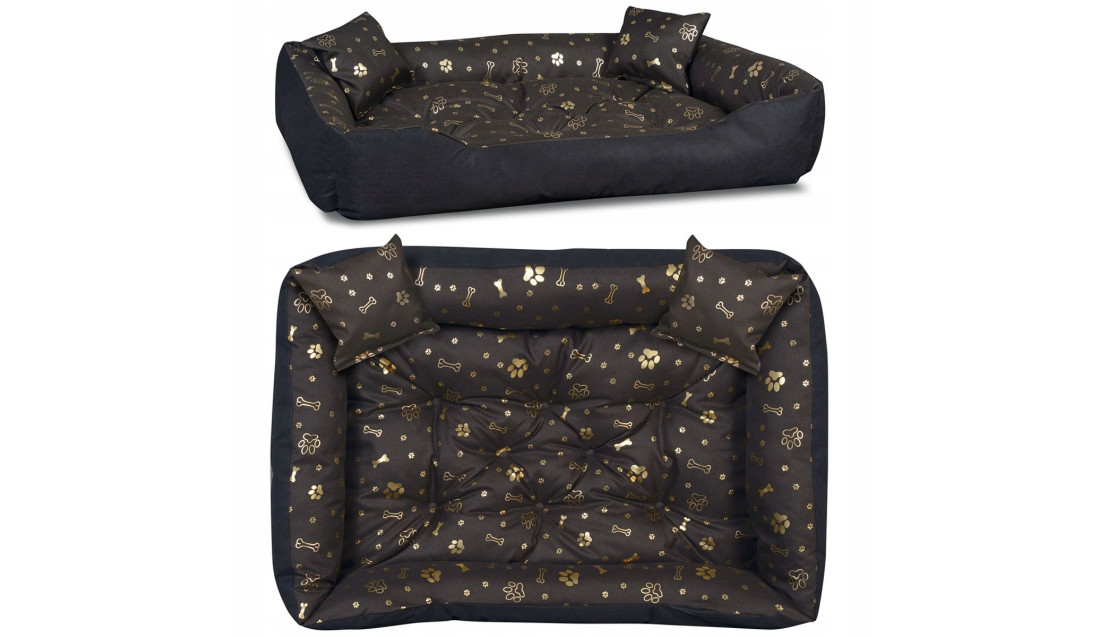 Strona górna materaca jest nieprzemakalna, w kolorze kolorze ciemnobrązowym z złotym nadrukiem w łapki i kości.