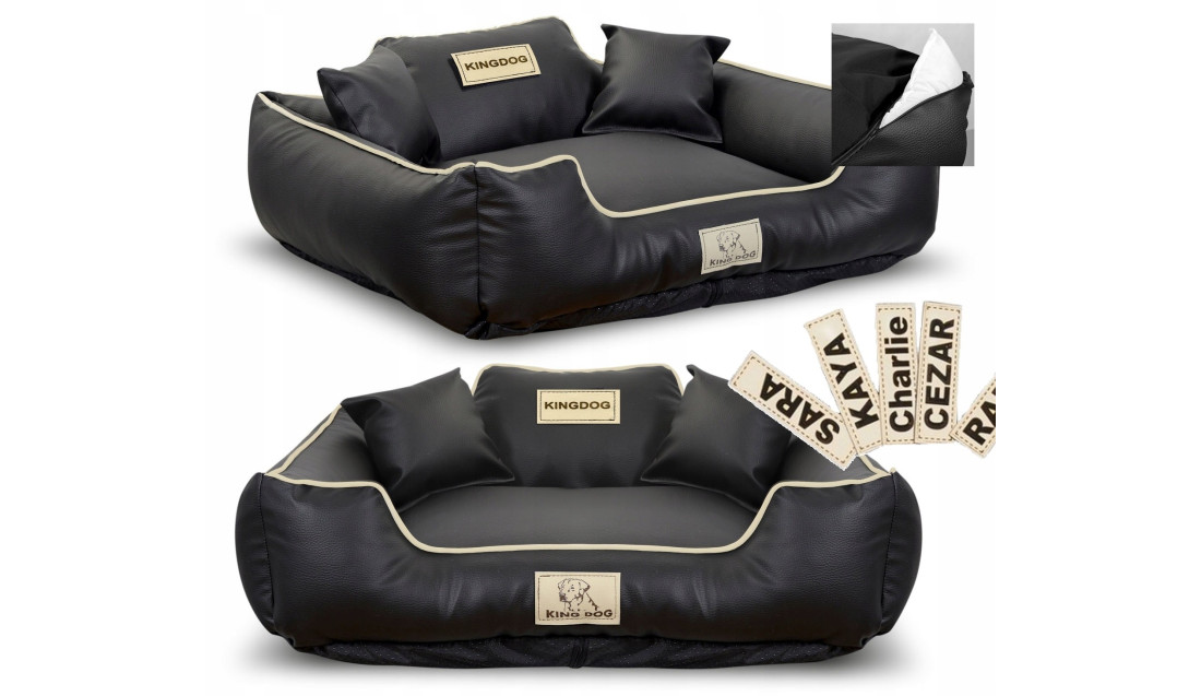 Wykonane z ECOSKÓRY, ROZBIERALNE z zamkiem, antypoślizgowe legowisko dla psa SLEEPuppy w kolorze czarnym z białą lamówką, PERSONALIZOWANE imieniem pupila!
