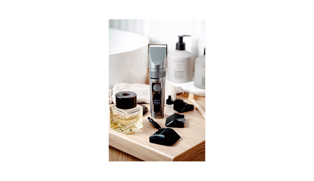- Wyświetlacz LCD: Informuje o stanie naładowania i aktywowanym trybie pracy, zapewniając kontrolę nad procesem strzyżenia.