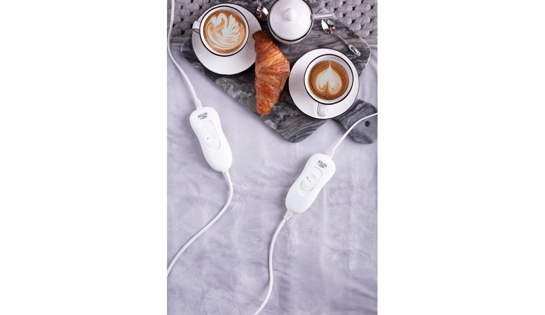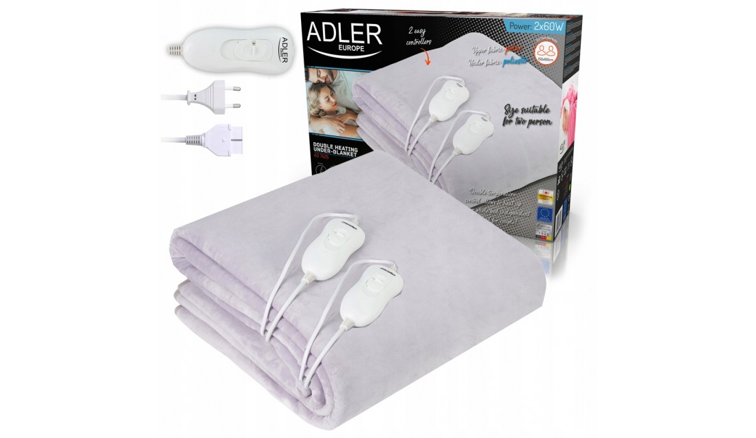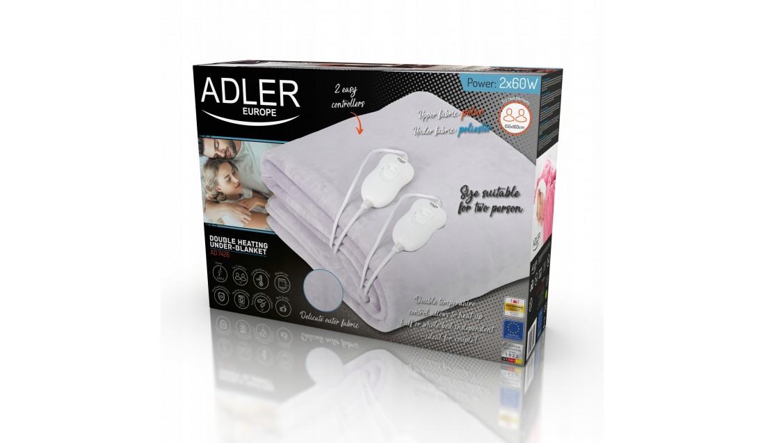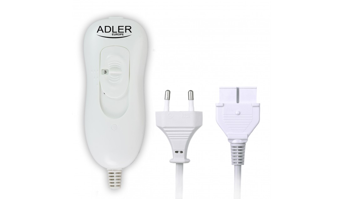 Elektryczny koc podkładowy Adler zapewnia ciepło i komfort wypoczynku. Jest również wskazane dla osób dbających o zdrowie. Uśmierza nerwobóle, koi zesztywnienie mięśni i usprawnia krążenie krwi. Łagodzi także dolegliwości reumatyczne. Zapewnia szybkie i równomierne rozprowadzenie ciepła co pozwala rozkoszować się ciepłą pościelą już w kilka minut po włączeniu. Koc wykonany jest z miękkiego, przytulnego i miłego w dotyku materiału. Można go prać po odpięciu kabla zasilającego i kontrolera temperatury. Ten ostatni pozwala wybrać poziom temperatury i zabezpiecza przed przegrzaniem.