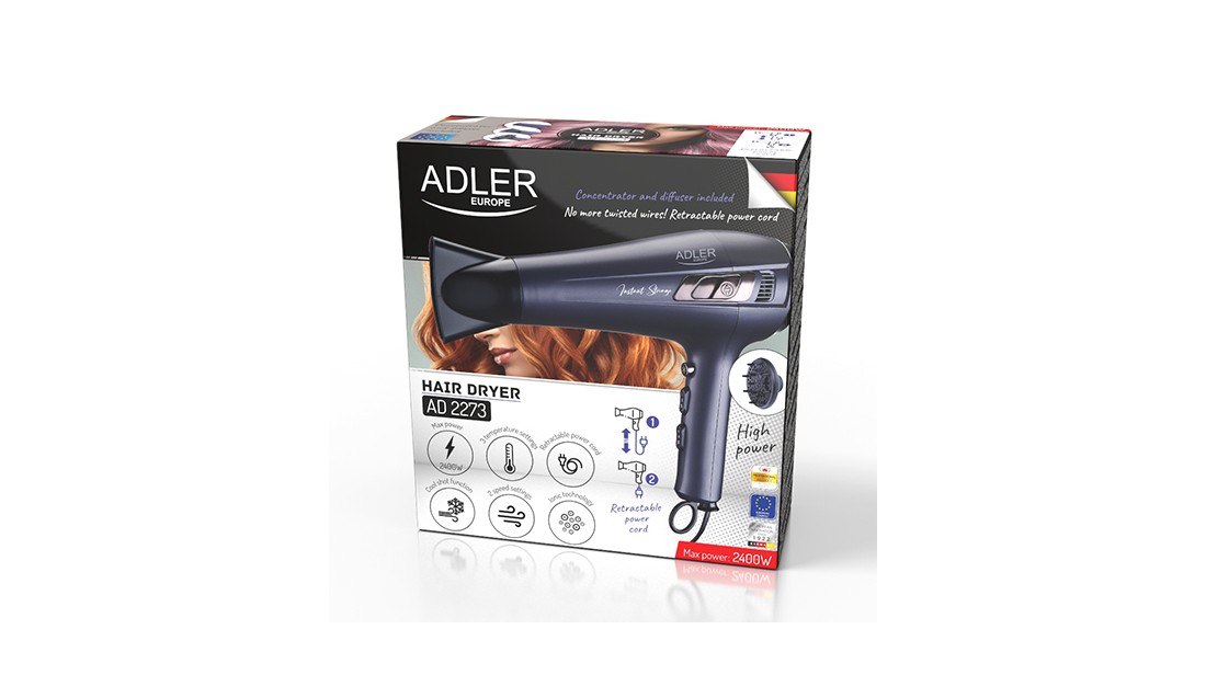 Poznaj suszarkę do włosów Adler AD 2273, która łączy w sobie wysoką moc, zaawansowaną technologię i wygodę użytkowania. Dzięki zwijanemu przewodowi, technologii jonizacji oraz funkcji chłodnego nadmuchu, suszarka ta spełnia wszystkie potrzeby związane z pielęgnacją włosów. Dodatkowe akcesoria, takie jak koncentrator powietrza i dyfuzor, umożliwiają tworzenie różnorodnych stylizacji.