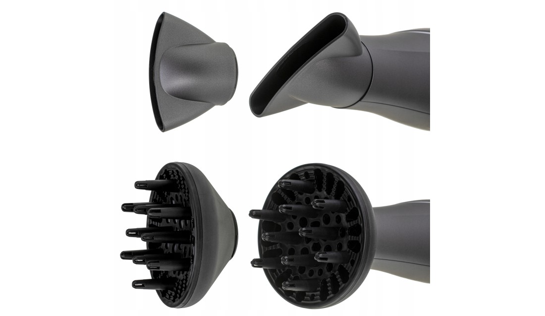 - Dyfuzor - idealnie sprawdza się przy stylizacji włosów kręconych lub falowanych. Jego struktura równomiernie rozprowadza powietrze, dodając objętości i podkreślając naturalne loki lub fale.