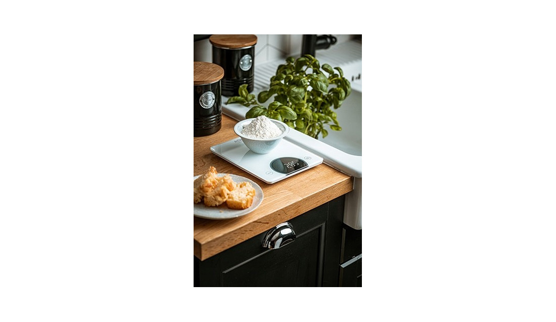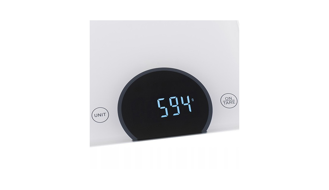 Elektroniczna waga kuchenna o udźwigu maksymalnym 10 kg. Niezwykle pomocna przy ważeniu ciężkich produktów. Ze względu na wyjątkową biel, waga prezentuje się pięknie w każdej kuchni. W wadze zastosowano wysokiej jakości wyświetlacz LED. Dzięki temu odczyt ma wysoki kontrast i jest niezwykle wyraźny.Cyfry wydają się wyżłobione światłem na czarnej powierzchni.