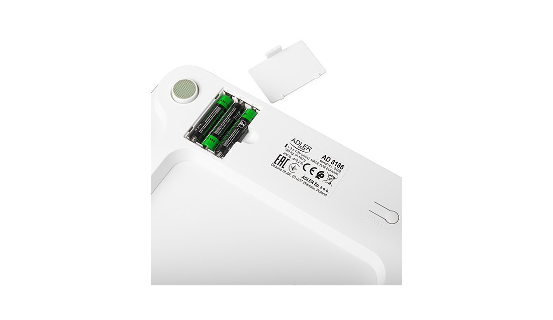 Zasilanie zapewniają trzy baterie AAA, które są dołączone do zestawu, dzięki czemu waga jest gotowa do użycia od razu po wyjęciu z opakowania.